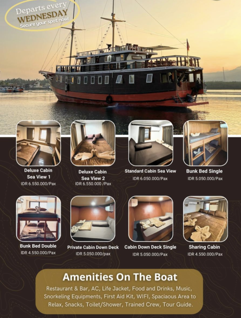 Destinasi pertama adalah Pulau Kenawa, sebuah pulau kecil di perairan Sumbawa yang terkenal dengan padang savana luas dan bukit kecil yang indah. Di sini, Anda akan melakukan soft trekking ke puncak bukit dan menikmati panorama matahari terbenam yang spektakuler. Setelah itu, perjalanan dilanjutkan menuju destinasi berikutnya, di mana Anda akan bermalam di atas kapal.